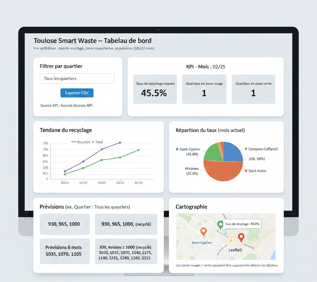 Toulouse Smart Waste & Recycling AI est un projet innovant visant à optimiser la gestion des déchets et du recyclage dans la ville de Toulouse grâce à l'intelligence artificielle, aux capteurs connectés et à l'analyse prédictive.